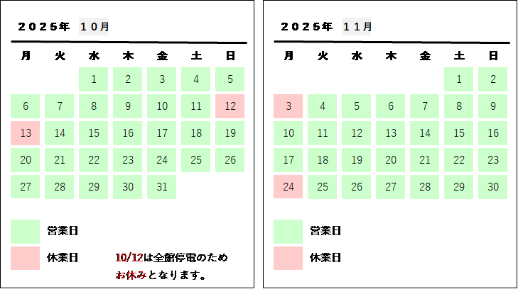 お知らせ(2025/10/01 更新) 平素は、リユースショップまちエコをご利用いただき、ありがとうございます。 リユースショップまちエコは祝祭日は休業日です。 10月および11月の営業は、以下のとおりになります。 皆様のご来店を心よりお待ちしております。