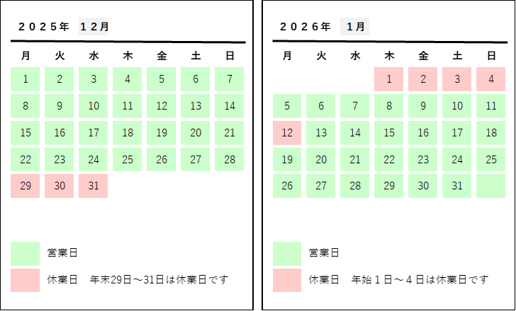お知らせ(2025/11/19 更新) 平素は、リユースショップまちエコをご利用いただき、ありがとうございます。 リユースショップまちエコは祝祭日は休業日です。 12月および1月の営業は、以下のとおりになります。 皆様のご来店を心よりお待ちしております。